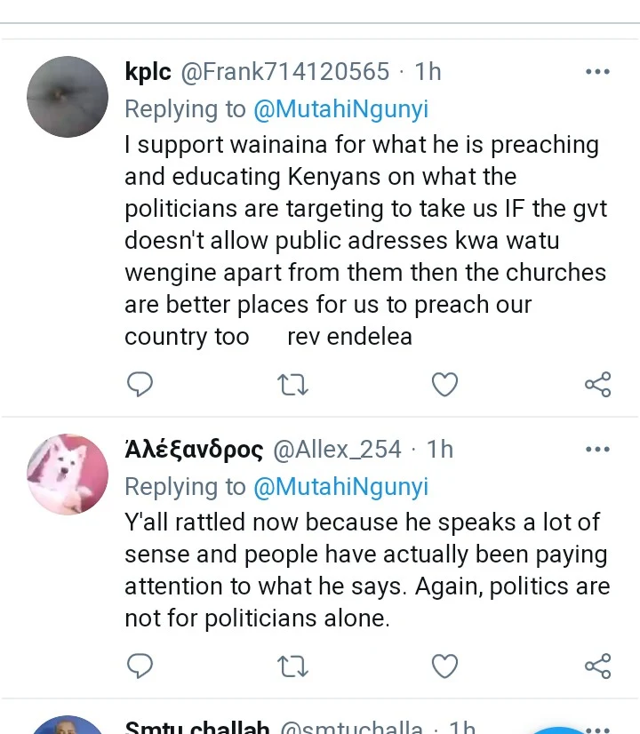 However, majority of Twitter users who reacted to Ngunyi's tweet, defended the preacher basically saying that he represented the voice of the majority.